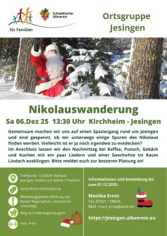 Die Adventswanderung, ursprünglich für Sonntag, den 07.12.2025, vorgesehen, findet nun bereits am Nikolaustag, Samstag, den 06.12.2025, statt.